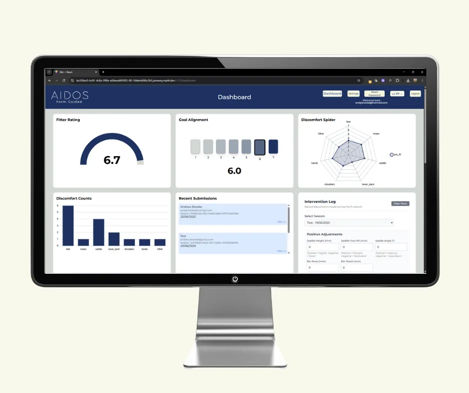 AIDOS is the complete business software for professional bike fitters: intake forms, online booking, CRM, and POS in one place. This page needs JavaScript to run. Please enable it, or contact andy@aidos.fit.